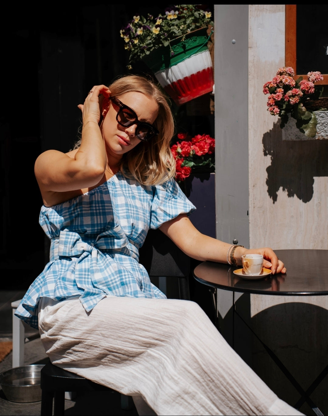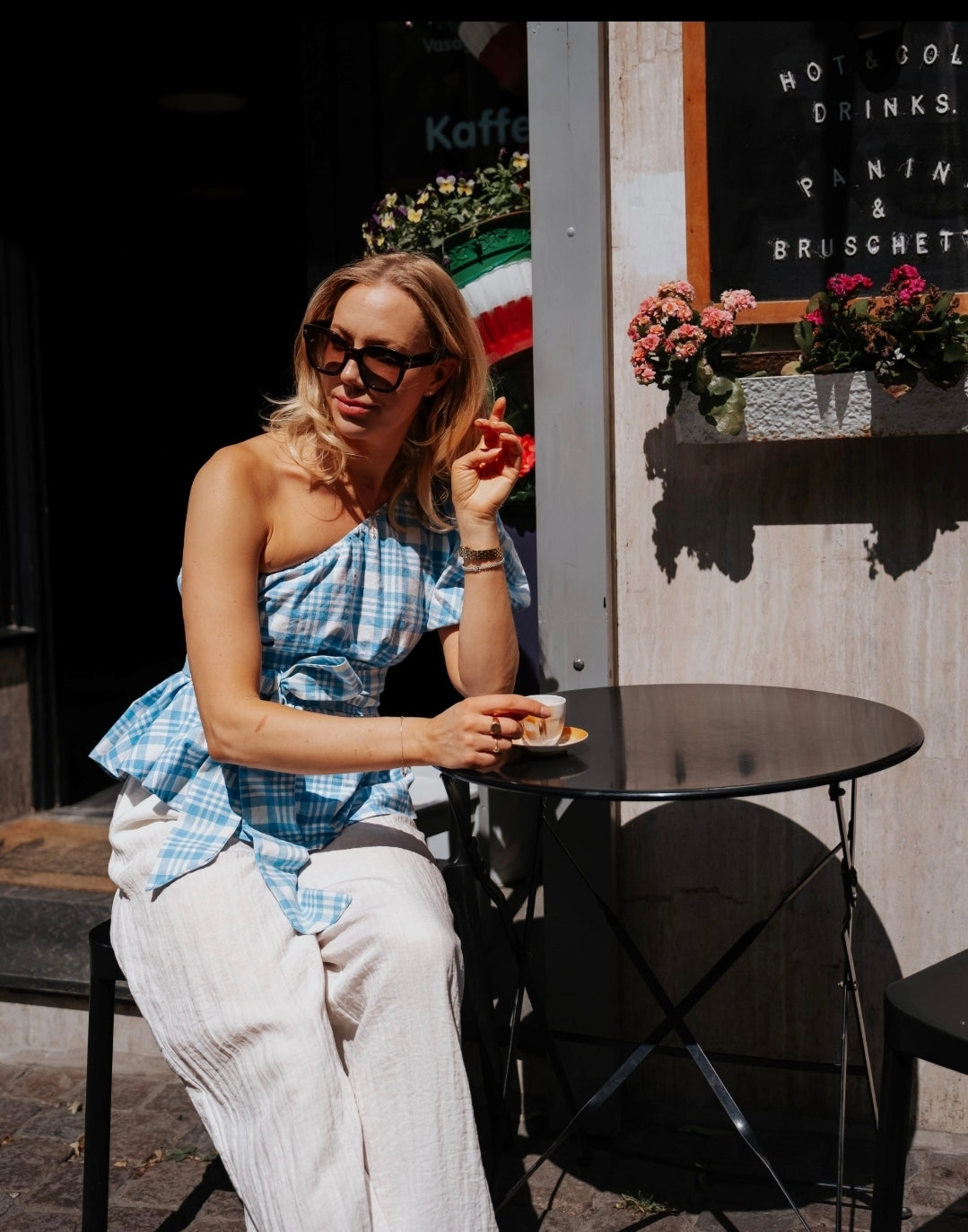 One shoulder puff sleeve with waistband in blue and white gingham.